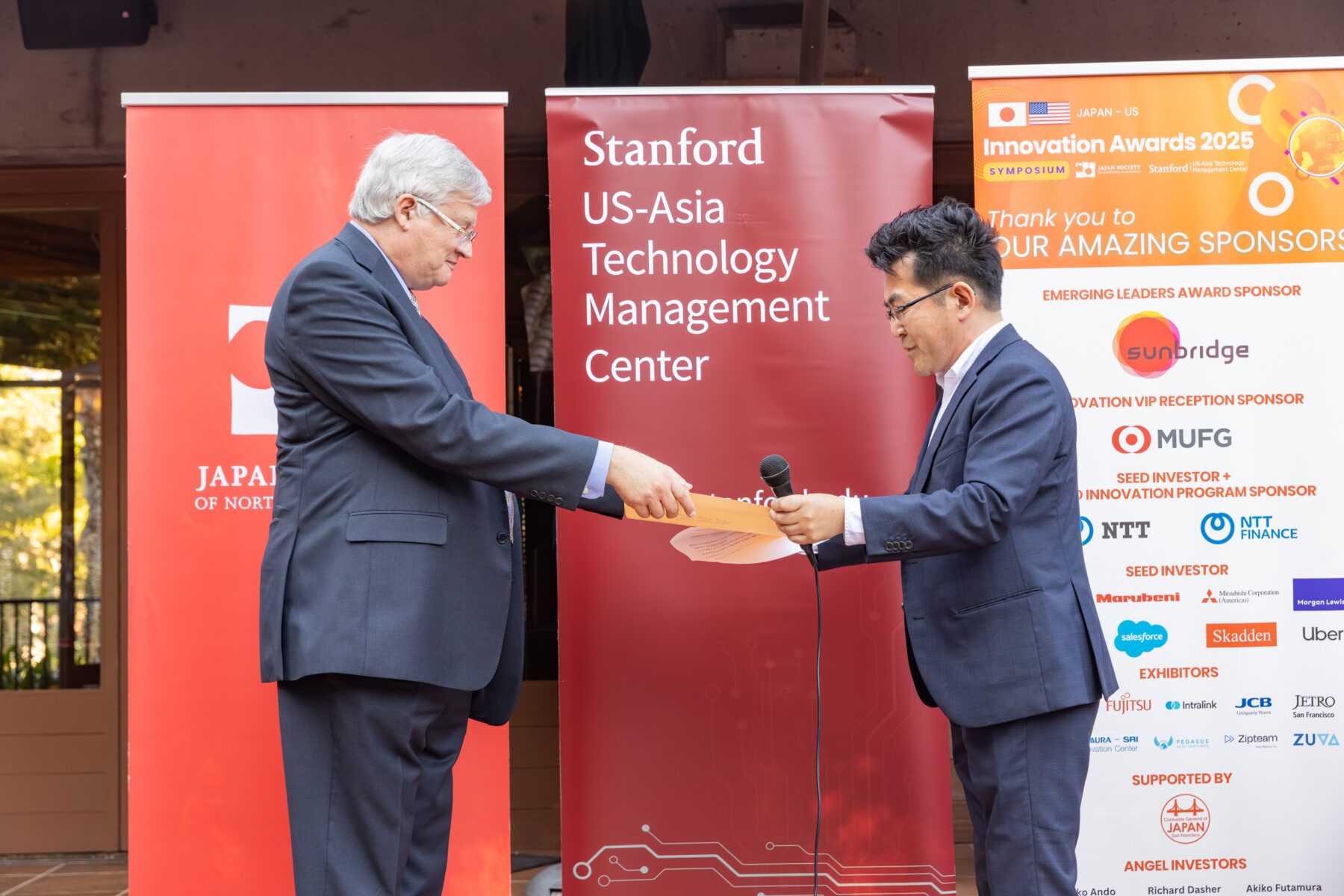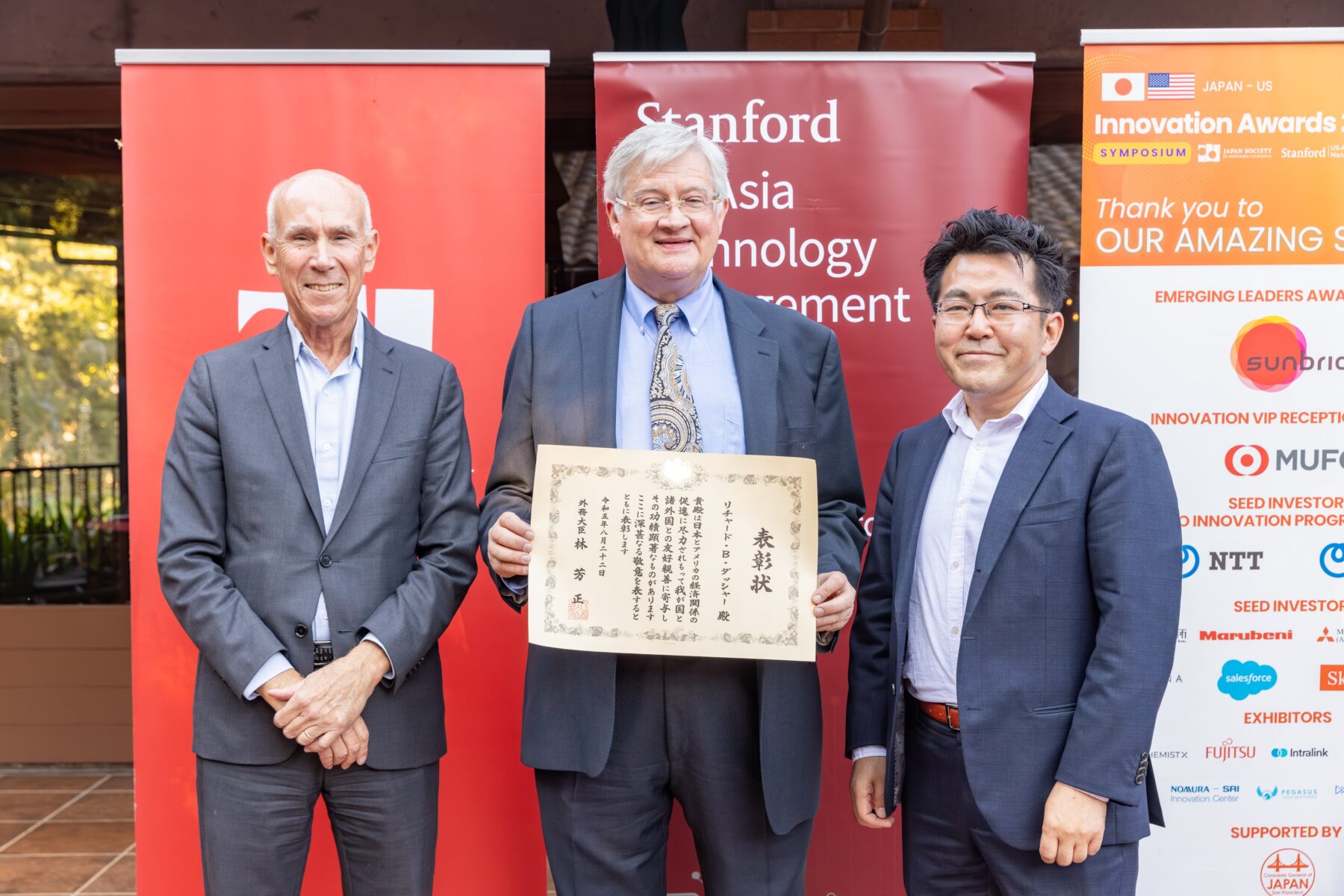 Congratulations to Dr. Richard Dasher, Adjunct Professor and Director of the US-Asia Technology Management Center at Stanford University, for being presented the Japanese Foreign Minister’s Commendation from Deputy Consul General Takeshi Ishihara. The presentation of the award took place during the 2025 Japan-U.S. Innovation Awards Symposium VIP Reception at the Stanford Faculty Club on July 17th.